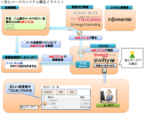 株式会社インフォマニア(本社:神奈川県横浜市、代表取締役社長:大西恒樹、以下インフォマニア)、シナジーマーケティング株式会社(本社:大阪市北区、代表取締役社長兼CEO:谷井等、以下シナジーマーケティング)、トライコーン株式会社(本社:東京都新宿区、代表取締役社長:花戸俊介、以下トライコーン)、ニフティ株式会社(本社:東京都新宿区、代表取締役社長:三竹兼司、以下ニフティ)、一般財団法人日本情報経済社会推進協会(東京都港区、会長:牧野力、以下JIPDEC)、株式会社パイプドビッツ(本社:東京都港区、代表取締役社長CEO:佐谷宣昭、以下パイプドビッツ)、ヤフー株式会社(本社:東京都港区、代表取締役社長:宮坂学、以下ヤフー)は、メールセキュリティ対策強化のための電子メール環境への取組として、なりすましメール防止安心マークを推進しております。このたび、安心マークの銀行への導入を開始いたしました。