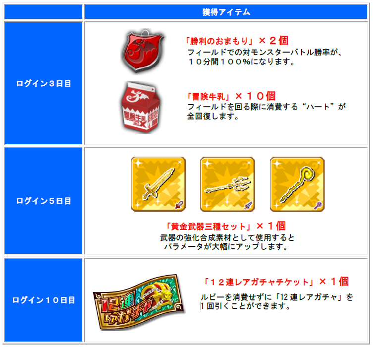 期間中、ログインした日数に応じゲーム内アイテムをプレゼントします。