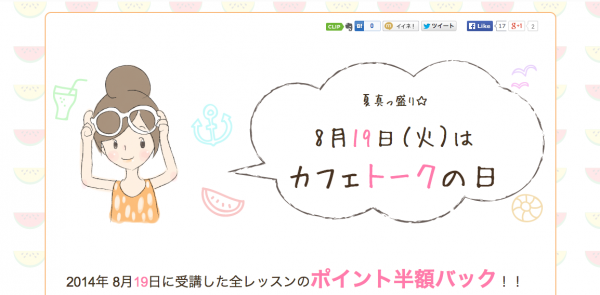 ご受講頂いたレッスンが最大3件まで、後日半額ポイントバックされる「カフェトークの日」。