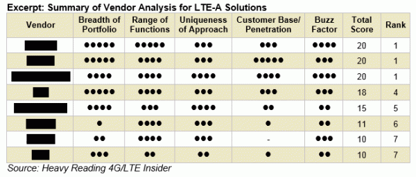 LTE-A Infrastructure: A Heavy Reading Competitive Analysis summarizes the drivers of LTE-A network investment, and assesses the products and solutions offered by the leading LTE infrastructure vendors. It focuses on the breadth of the vendors' portfolios, the number of Release 11 and 12 LTE-A features they have enabled and the additional related capabilities they have developed, their success at selling their solutions, and the buzz they have succeeded in building around their approach to LTE-A. It applies a ranking overall to eight leading vendors, and describes their LTE-A approaches and offers.