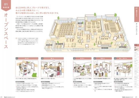 シーン別のトップページには小学校・中学校をイメージしたイラストを大きくレイアウト。「学び合う」「調べる」など児童・生徒の活動ごとに、「ものを広げて作業できる大型テーブル」「グループで考えをまとめるホワイトボード」など家具計画のポイントを網羅し、一目見て必要な家具を理解できるページ構成になっています。