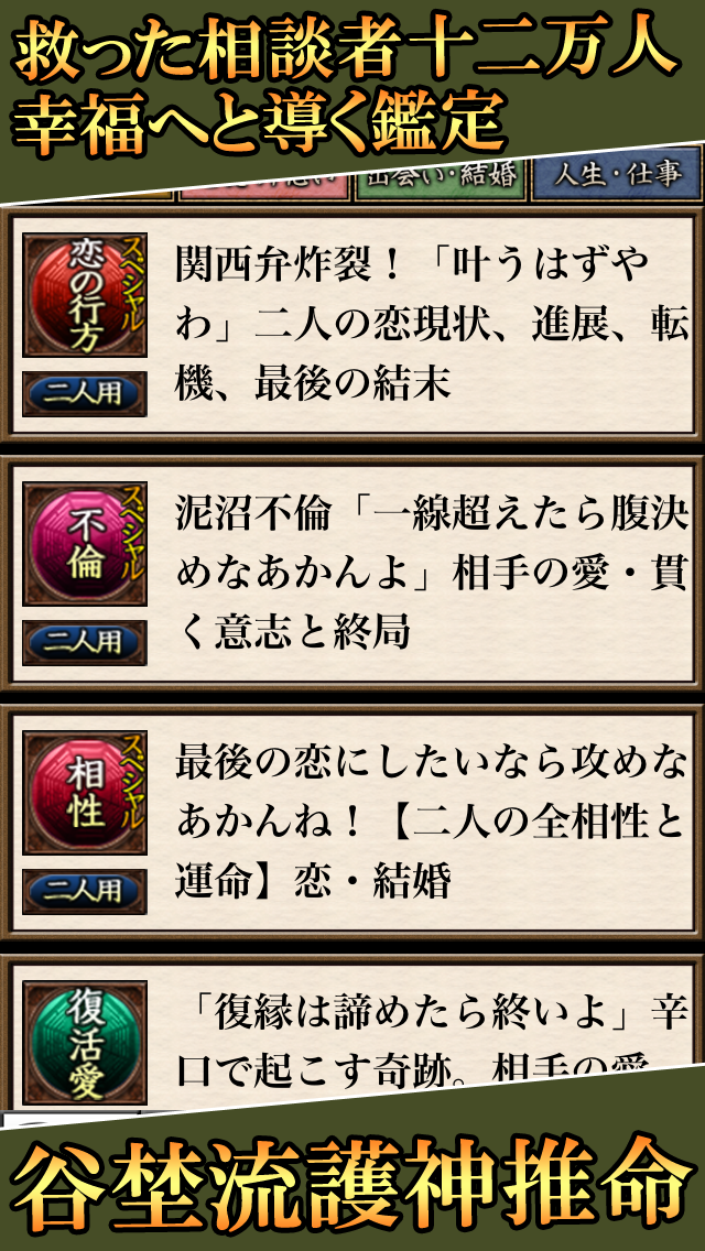 無料鑑定は『明日のあなたはこうすべき』『あなたの基本性格』『あの人の基本性格』『今のあなたの運勢状況』の4種類。さらに有料鑑定では、恋愛の悩みはもちろん、結婚の悩み、人生の悩みなど、さまざまな悩みに対応した鑑定メニューを多数ご用意しております。