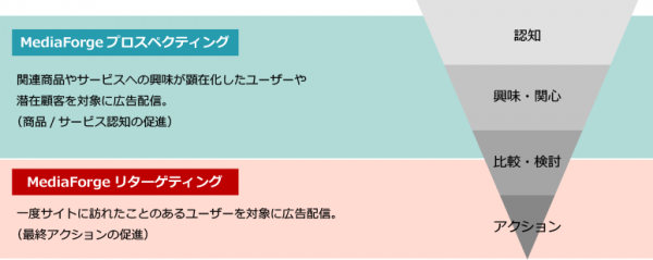 広告主は、「MediaForge」のプロスペクティング広告を活用することで、まだサイトに訪れたことのない潜在顧客を顕在化し、商品やサービスの購買を促すことができます。また、サイトに訪れた人を対象とした「MediaForge」のディスプレイ広告配信サービスであるリターゲティング広告と組み合わせることで、広告主は、ユーザーのアクションを総合的なアプローチで促進できるため、集客や売上拡大が見込めます。