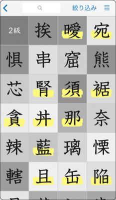 すべての常用漢字または各級の配当漢字をタイル表示で一覧。辞書のように漢字の部首や意味などをすぐに調べることができます。漢字を確認するたびにタイルが黒くなっていく使い込み度表示マーカーにより、やる気もアップ。任意の漢字を黄色のマーカーでマーキングできるので、覚えたものとそうでないものを分けられます。また、「級/画数/部首/読み」での並べ替えや絞り込みもできます。