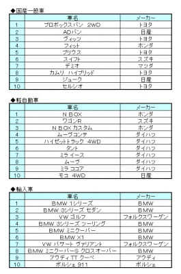国産一般車部門は、プロボックス バン(トヨタ)が不動の人気を誇るプリウス(トヨタ)を追い抜き首位に。更に、カムリ ハイブリッド(トヨタ)は今年初のランクインを果たしました。軽自動車部門は、N BOX(トヨタ)、ワゴンR(スズキ)、N BOX カスタム(ホンダ)など人気車種が先月に引き続きTOP3を独占。続いてダイハツ車が大半を占める結果となりました。輸入車部門は、トップを守り続けたBMW 3シリーズ セダンを抜き、BMW 1シリーズが首位を獲得。VWゴルフは常にランクインし、好調を維持しています。