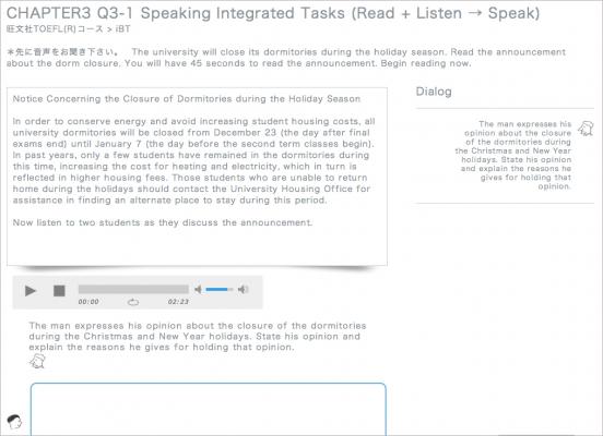 本コースでは、旺文社の「TOEFL(R)テスト大戦略シリーズ」の 『TOEFL(R)テストスピーキング問題110[改訂版]』『TOEFL(R)テストライティング問題100[改訂版]』に掲載されている問題を元に、「ベストティーチャー」上でWritingレッスンとSkypeレッスンを24時間いつでも受講することができます。