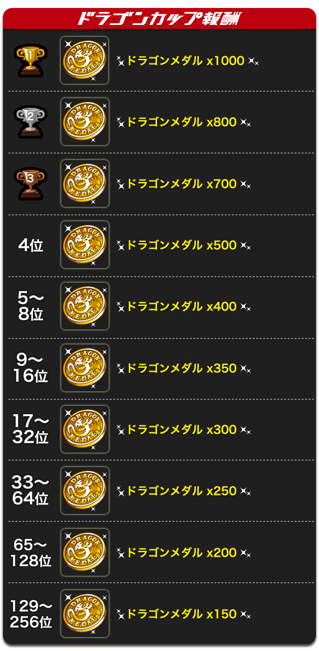 本リーグでの順位に応じて、「ドラゴンメダル」を報酬として贈呈いたします。順位によっては