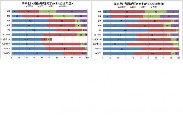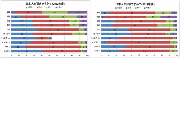 前述のアンケート同様、韓国における2012年11月度の日本人が好きかという調査では、「大好き」「好き」の回答が合わせて40%でした。一方2014年度の調査では、「大好き」「好き」と回答した人が合わせて71%となり、31%上昇しています。同様に中国における2012年11月度の調査では、「大好き」「好き」の回答が合わせて50%でしが、2014年度の調査では「大好き」「好き」の回答が合わせて59%となり、9%上昇しています。
