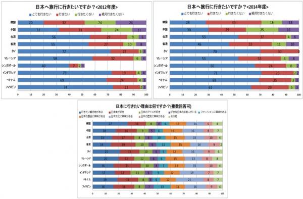 日本政府は、東京オリンピックが開催される2020年までに、訪日外国人2000万人を目標に掲げています。タイにおいて、2012年11月度の調査では、日本へ旅行に「とても行きたい」「行きたい」という回答が合わせて94%と高い数値でしたが、2014年度の調査では、100%の人が日本へ旅行に「とても行きたい」「行きたい」と回答しています。タイだけではなく、東南アジアのマレーシア、シンガポール、インドネシア、ベトナム、フィリピンでは、日本へ旅行に行きたいとの回答が「とても行きたい」「行きたい」合わせていずれも85%を超えており、東南アジアの人々が観光地として日本に注目している事が伺えます。