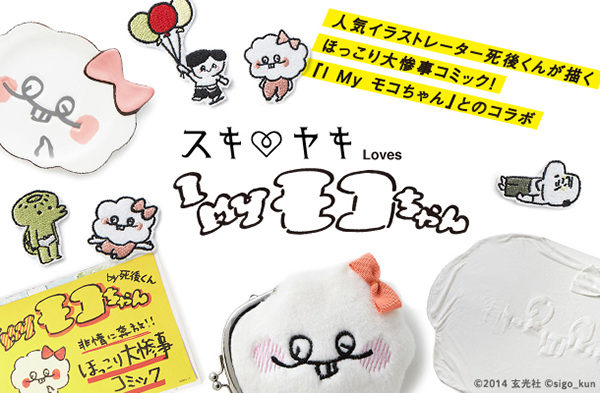 株式会社フェリシモ(神戸市中央区)のジャパニーズポップカルチャー・コラボプロジェクト“スキヤキ”は、人気のイラストレーター・死後くんが描く話題のコミック『I My モコちゃん』(玄光社)とのコラボアイテムの販売を、スキヤキのウェブサイト限定で、2014年8月27日(水)よりスタートいたします。アイテムは、メインキャラクター“モコちゃん”の顔のシルエットのビッグTシャツ、ふわふわのがま口ポーチ、磁器プレートと、登場キャラクターたちのワッペンセットの4アイテムです。コラボ商品購入特典として、死後くん書き下ろし漫画もセットでお届けいたします。