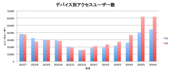 2013年7月~2014年6月までのスマートフォン経由のアクセス数は、ここ半年で大幅に増加し、2014年6月のスマートフォンユーザーの割合は全体の58.3%となりました。1年前の2013年7月時点ではスマートフォンユーザーの割合は49.5%で、1年間で10%近くの割合が増えています。