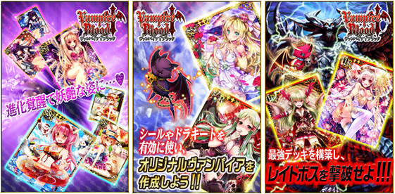 本作は、「聖なる血」を持つ者である主人公が、血の契約を結んだヴァンパイアを従えて、人類滅亡を目論むヴァンパイアと戦っていく、リアルタイムギルドバトルが特徴のカードバトルゲームです。街に潜むヴァンパイアと血の契約を交わして、仲間に加え、さらに進化合成を繰り返すことでヴァンパイアをより強力に覚醒させることもできます。