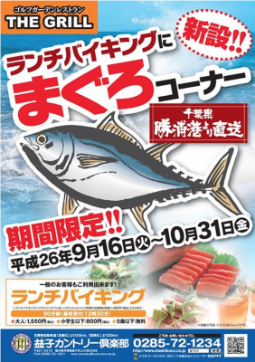 < 「益子カントリー倶楽部」 情報 > 千葉・勝浦港より直送の「まぐろ」コーナー! 期間限定:9/16~10/31まで、好評のランチバイキングで新登場!!