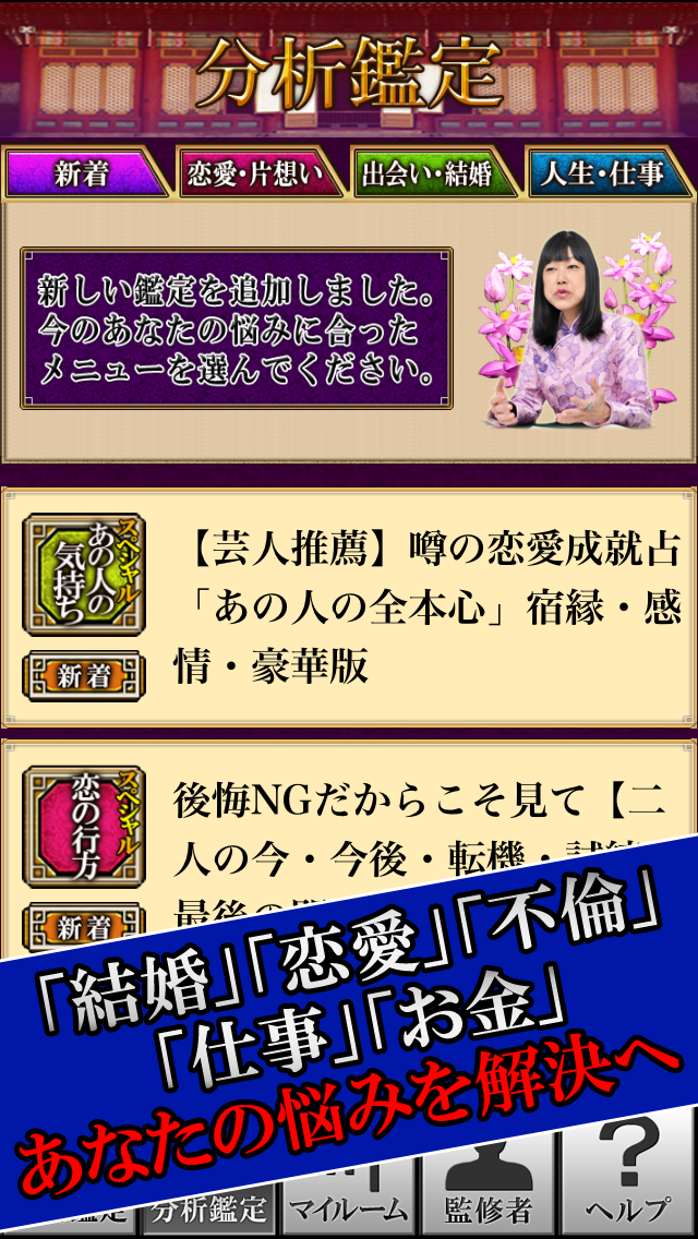 無料鑑定は『明日のあなたの運勢』『あなたの本質』『あの人の本質』『幸福になれる吉方位』の4種類。さらに有料鑑定では、恋愛の悩みはもちろん、結婚の悩み、人生の悩みなど、さまざまな悩みに対応した鑑定メニューを多数ご用意しております。