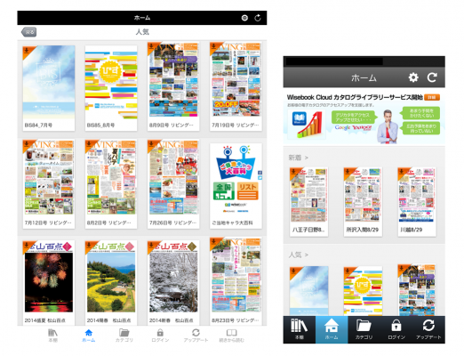 「Wisebook Cloud」 カタログライブラリーサービスとは、iOSやAndroidデバイスで利用できるコンテンツビューア「OpenViewer」の中で、新聞、フリーマガジン、電子カタログなど様々な電子コンテンツが無料で楽しめるサービスです。