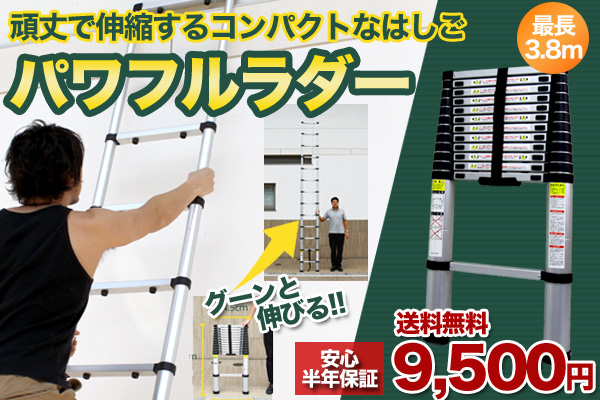 従来のはしごは持ち運びが大変で収納時には十分なスペースが必要でした。しかし、伸縮はしごパワフルラダーは収納時わずか94cm。使用時には最大3.8mまで伸ばして使用することができるのが特徴。また、耐荷重は150Kgと非常に堅牢で持ち運びに優れたはしごです。8月20日より絶賛販売中です。