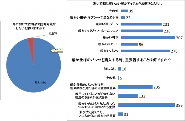 この調査で、96.4%のママ世代の女性が「冬に向けて衣料品で防寒対策をしたい」と回答しました。また「寒い時期に買いたいアイテム」について聞いたところ、「暖かい靴下」に次いで、「暖かいパンツ」、「暖かい靴・ブーツ」がランキングにあがりました。さらにパンツについて「購入する時、重要視すること」を聞いたところ、「色や柄など見た目の可愛さ」「シルエットのきれいさ」を重要視するという回答がありました。自由記述欄では、「見た目が可愛くて防寒対策用に見えない物」や「薄いけれど手入れがしやすいあったかアイテムで、オフィスカジュアルにもOKなパンツがあったら良い」などの回答がありました。
