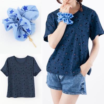 明るいブルーに、星柄がプリントされた大振りなシュシュです。