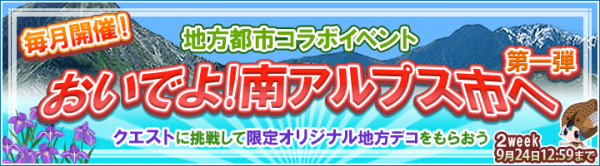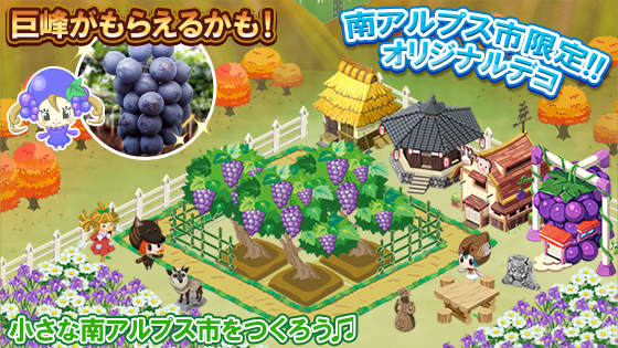 本イベントでは、同市にまつわるクエストのクリア報酬として同市オリジナルのデコレーションアイテムを配布いたします。また、ゲーム内で特定作物を育てると、抽選で同市特産巨峰を南アルプス市より抽選で30名様にプレゼント。提携イベントは2015年2月まで、プレゼントはその時の旬のものに変えて毎月開催いたします。