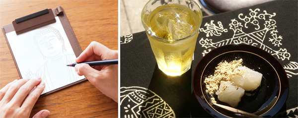 光明時本堂にてお経を聞いた後、本堂前の「神谷町オープンテラス」にて、ご本尊である「阿弥陀如来」を写仏します。描くことに集中する時間を持つことで心が落ち着き、写仏後はすっきりとリフレッシュできます。その後、お寺でいれたお茶とお坊さん手づくりの和菓子をいただきながら、語らいの時間となります。お寺文化に興味のある方はもちろん、最近疲れ気味の方や、もやもやしていて心が晴れないという方におすすめです。都心のオアシスのようなお寺で、新感覚の癒しの時間を提供いたします。