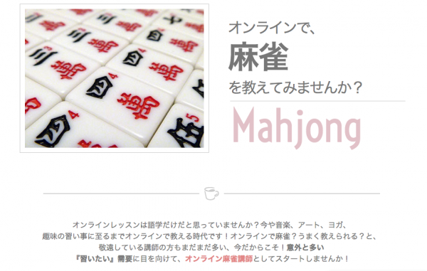 その流れを汲み、語学以外のレッスン、カテゴリを充実させるため、この度「オンライン麻雀講師」募集ページをリリース致しました。