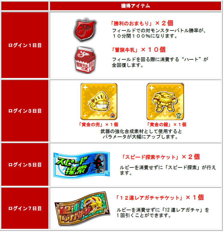期間中、ログインした日数に応じゲーム内アイテムをプレゼントします。
