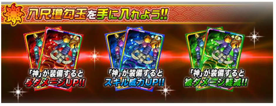 「八尺瓊勾玉」が稀に出現します。この「八尺瓊勾玉」は、火森水の3 属性があり、種族「神」
