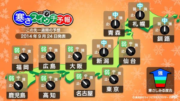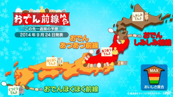 生活密着型天気予報を配信する株式会社ライフビジネスウェザー(本社:東京都中央区、代表取締役:石川勝敏 以下、LBW)は、2014年9月24日、特設サイトにて寒さの到来をいち早く伝える「寒さスイッチ予報」及び、寒さと関係のあるおでんのおいしい度合を伝える「おでん前線」予報の第2回発表を行いました。