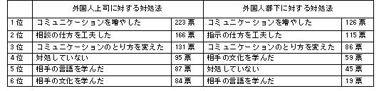 外国人上司・部下への困りごとに対して、「コミュニケーションを増やした」(対上司223票、対部下126票)が一番多くとられた対処法でした。続いて、「指示・相談の仕方を工夫した」(対上司166票、対部下115票)、「コミュニケーションのとり方を変えた」(対上司131票、対部下86票)がランクインし、困りごとに多かった「言語」や「文化」を学ぶことよりもコミュニケーションの工夫を重視した人が多いようでした。