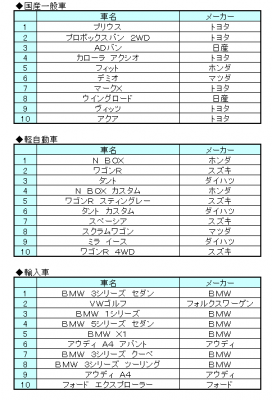 国産一般車部門は、4カ月ぶりにプリウス(トヨタ)がトップに帰り咲き。プロボックスバン 2WD(トヨタ)、ADバン(日産)は1つずつランクを落としたものの、トップ3を譲りませんでした。軽自動車部門は、今月もN BOXが首位に。続くワゴンR(スズキ)、タント(ダイハツ)も人気は継続中です。8位のスクラムワゴンは今年初のランクインとなりました。輸入車部門は、BMW車が大半を占める中、ゴルフが2位にランクインと奮闘。やはり人気は衰えません。アウディ A4も9位に入り込み、4カ月ぶりのランクインとなりました。国産車、輸入車ともに常連の人気車種が上位を占める中、根強くランクインする車種もあり、今後の動きからも目が離せません。