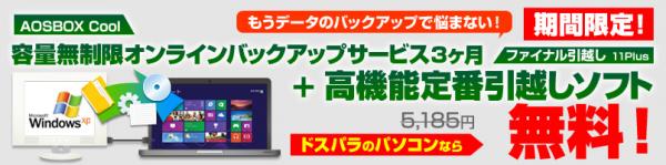 株式会社サードウェーブデジノスは、2014年9月25日(木)より、同社製のパソコンをご購入者様すべてに、AOSテクノロジーズ株式会社の提供する、容量無制限でパソコンのデータをバックアップできるクラウドバックアップサービス「AOSBOX Cool 3ヶ月版」と、ソフトも設定も簡単に移行できる定番のパソコン移行ツール「ファイナルパソコン引越し11plus ダウンロード版」をセットで無料プレゼントする、「パソコンのバックアップも引越しもプレゼント!」キャンペーンを、全国20の「ドスパラ」各店舗およびドスパラ通販サイトにて期間限定にて開始いたしました。