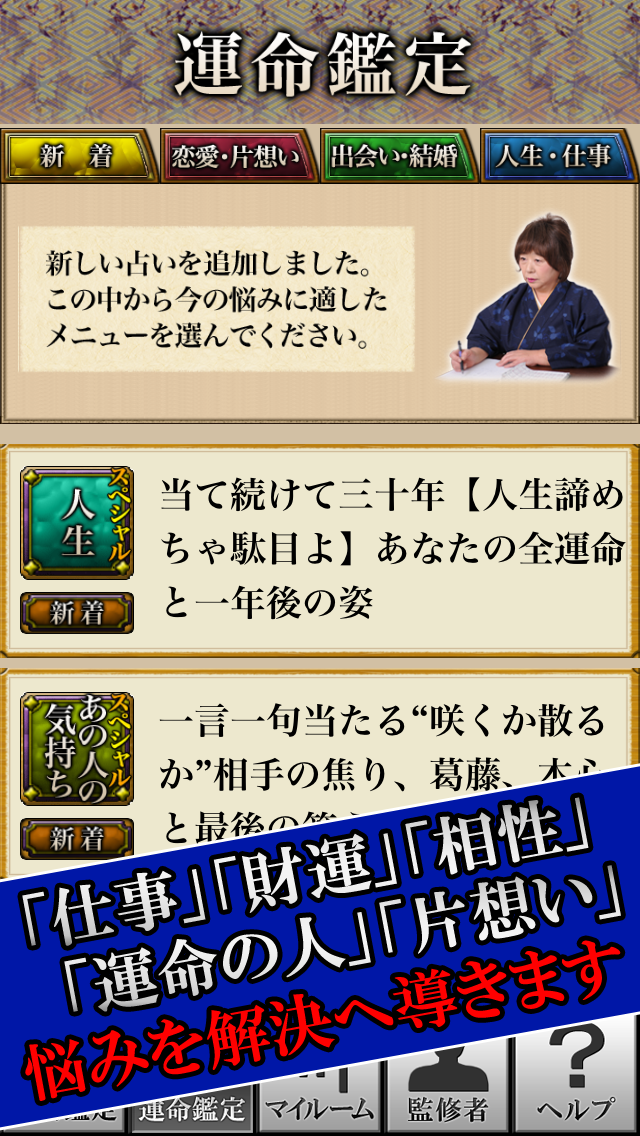 無料鑑定は『明日はこうして生きなさい』『あなたの基本性格』『あの人の基本性格』『あなたの現状について』の4種類。さらに有料鑑定では、恋愛の悩みはもちろん、結婚の悩み、人生の悩みなど、さまざまな悩みに対応した鑑定メニューを多数ご用意しております。