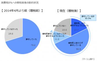 まずは、2014年4月の増税前後の節約意識の変化を尋ねたところ、「節約している」との回答が、増税前は70.2%であったが、増税後では80.0%となり、9.8ポイント高い。中でも、「より節約するようになった」17.7%、「増税前は節約していなかったが節約するようになった」11.8%となり、消費者の節約意識が高まっている様子がうかがえる。