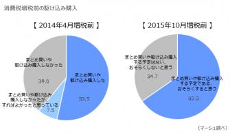 2014年4月の増税前にまとめ買いや駆け込み購入をしたかどうかを尋ねると、53.5%が「まとめ買いや駆け込み購入をした」と回答している。さらに、2015年10月の増税前に駆け込み購入する予定があるかどうかを尋ねると、65.3%が何かしら「まとめ買いや駆け込み購入をする予定である、おそらくすると思う」と回答している。2015年10月では、より増税を意識した消費行動が表れることも考えられる。