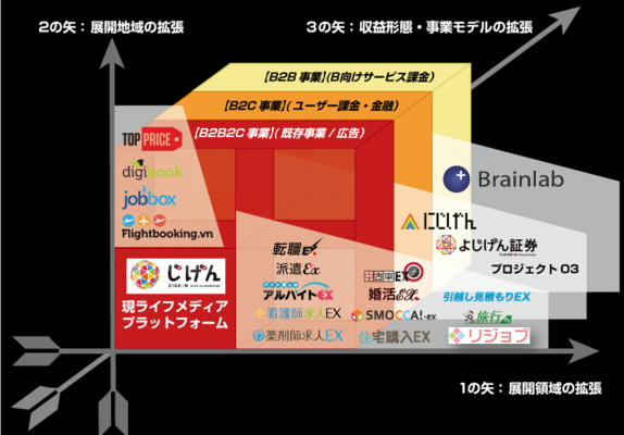 当社グループは「生活機会の最大化」を基本理念として掲げ、「ジゲノミクス3本の矢」という成長戦略により、時価総額1兆円企業を目指しています。具体的には、1本目の矢として当社の主力事業であるライフメディアプラットフォーム事業の領域展開の拡大を進めながら、2本目の矢としてサービス展開地域の拡張を行い、3本目の矢としてビジネスモデルの多角化を行う戦略です。
