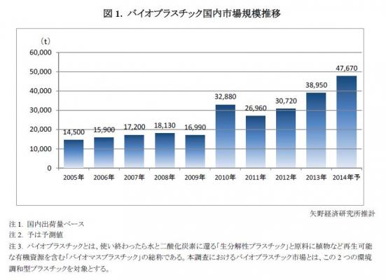 ◆ 2014年のバイオプラスチック市場規模は47,670t、前年比22.4%増を予測、今後も拡大基調