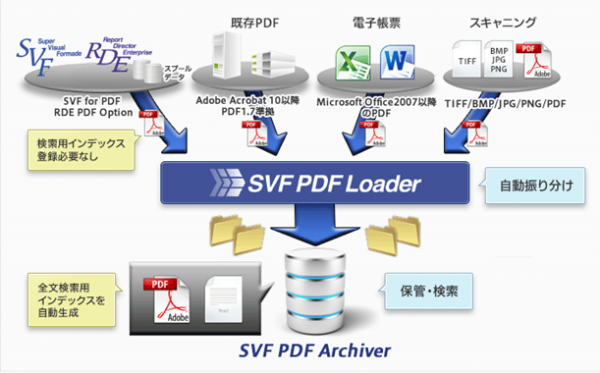 「SVF PDF Loader Ver.9.2」は、SVFで出力したPDF帳票をはじめ、スキャニングやWord・Excelで作成したPDF帳票を、条件に合わせて指定したフォルダーへ自動振り分けします。PDF帳票の保管・検索を効率化する製品「SVF PDF Archiver」と組み合わせることにより、一定期間の保管が必要な帳票や、部門や部署、拠点などで散在するドキュメントを、PDFで適切かつ長期的に保管運用し、必要時に正確かつ漏れなく検索・参照できる環境を提供します。