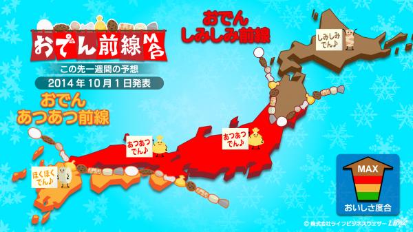 生活密着型天気予報を配信する株式会社ライフビジネスウェザー(本社:東京都中央区、代表取締役:石川勝敏 以下、LBW)は、2014年10月1日、特設サイトにて寒さの到来をいち早く伝える「寒さスイッチ予報」及び、寒さと関係のあるおでんのおいしい度合を伝える「おでん前線」予報の第3回発表を行いました。