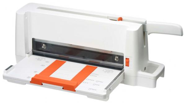 針なしホッチキスは止め位置が難しく、通常の針よりもとじ付ける部分に多くの面積を必要とするので、とじる位置を簡単に確認できる「見えとじスコープ」の機能は嬉しい。また、「2穴ファイル対応ゲージ」も搭載し、とじ穴をファイリング用に流用するアイデアは秀逸だ。ホッチキスが穴あけパンチにもなる利便性と、結果的に卓上の文房具を減らすことができることに着目した点を評価したい。