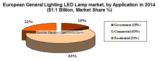 エレクトロニキャスト社は、欧州の一般照明用LED電球の欧州での消費は2014年に11億ドルに達すると予測している。商用と産業用の利用が2013-2018年の市場を占有するが、行政と住宅用/その他の年間成長率が高いだろう。商用/産業用では特にPAR電球、MR電球、一般型電球が多く、行政では街灯用製品が多く、住宅用では一般型と一般型/MR電球が比較的多いだろう。