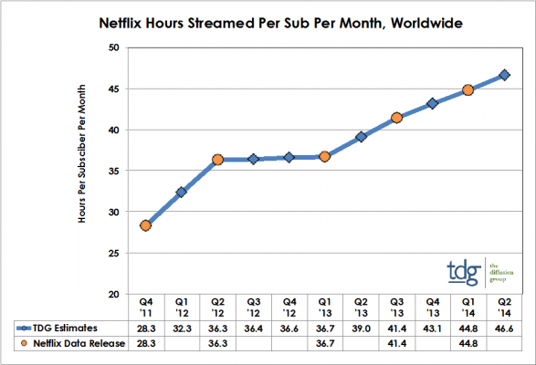 TDGリサーチ社の新刊レポートは、Netflixのストリーミング配信サービスが、2011年第4四半期の配信時間20億時間から2014年第2四半期の70億時間へと直近の10四半期間において350%増の成長をみせていると伝えている。TDGリサーチ社の調査レポート「Netflix 2014年:米国市場は独占、世界市場では拡大 - Netflix 2014 - Domestic Dominance, International Escalation」では、Netflixについての最新分析情報を提供し、サービス加入者数の成長とストリーミング配信時間について調査を行い、それらについての2022年までの国内予測を行う。同レポートはまた、Netflixにとっての新たな分野である世界市場へのサービス導入についても解説している。