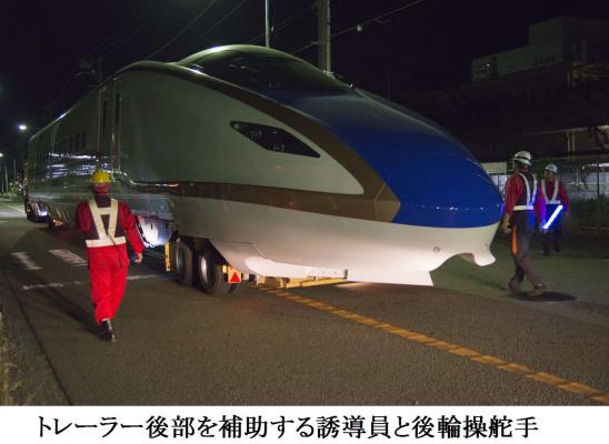 輸送は、北陸新幹線の先頭車両や中間車両を1日2両ずつ、交通量の少ない深夜から早朝の時間帯に、ドライバーや交通整理などを行う地上誘導員約30人の作業チームを投入して実施。6月は計12両、7月には計6両の輸送を行い今秋に全車両の輸送を完了する予定です。
