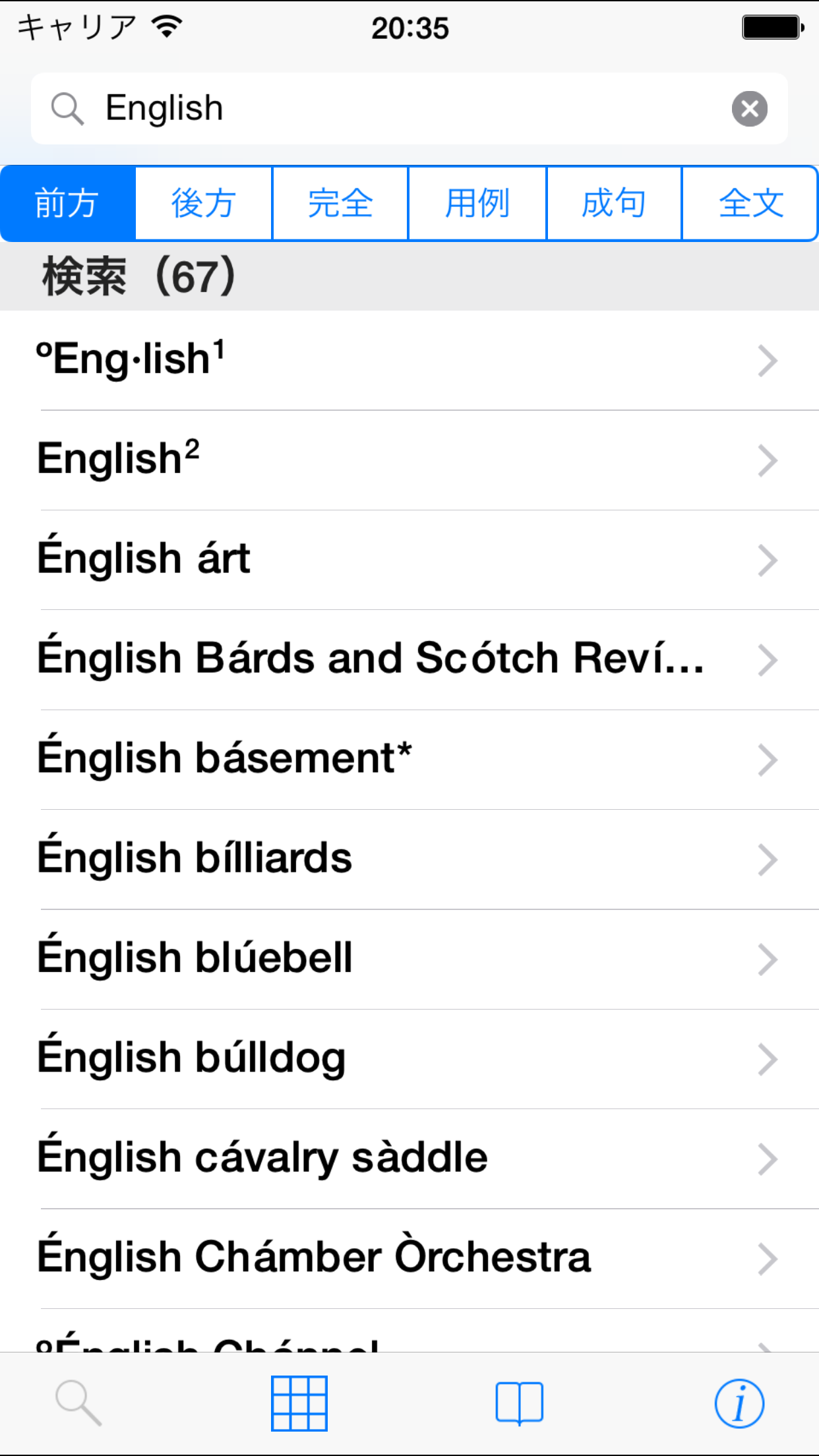 ●豊富な検索オプションを用意(前方一致 / 後方一致 / 完全一致 / 部分一致 / 全文検索)。それぞれの検索方法で、文字を入力すると候補見出し語が表示されるインクリメンタルサーチに対応。(部分一致/全文検索を除く)用語をうろ覚えでも検索が容易です