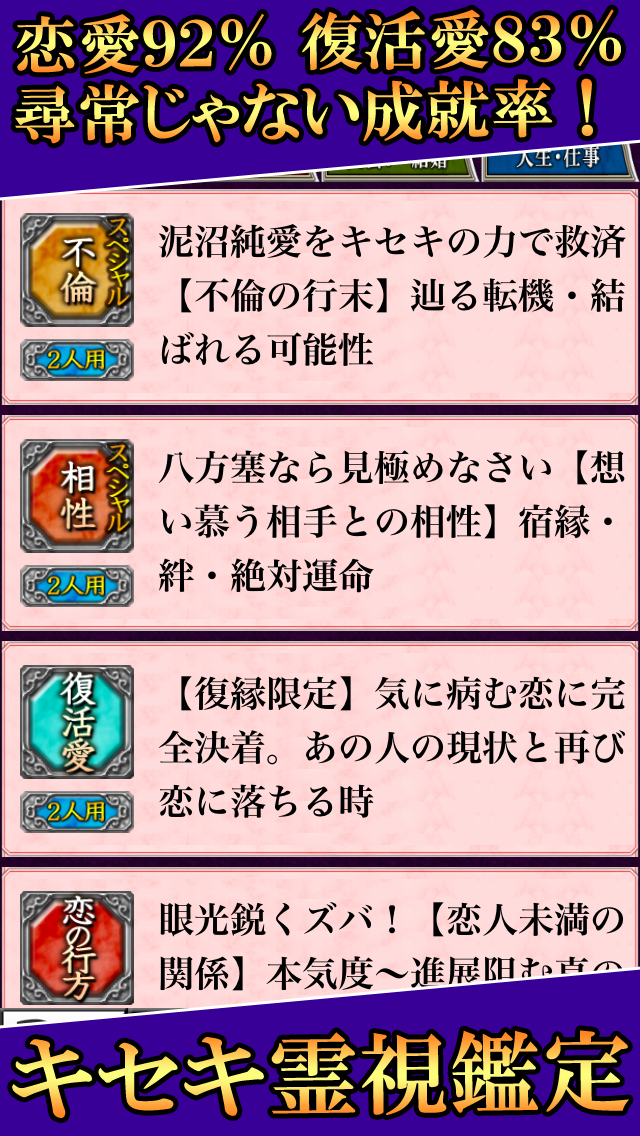 無料鑑定は『今日の運勢とキセキの言葉』『あなたが持つ本来の性格』『あの人が持つ本来の性格』『あなただけの人間性』の4種類。さらに有料鑑定では、恋愛の悩みはもちろん、結婚の悩み、人生の悩みなど、さまざまな悩みに対応した鑑定メニューを多数ご用意しております。