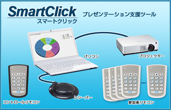 SmartClickソフトウェアは、「Microsoft PowerPoint」のアドインです。プレゼンテーションの途中でスライドショーを中断することなく、参加者に対して質問やアンケートを実施することができ、リアルタイムの反応や意見を簡単に集計することができます。参加者がリモコンを利用して質問に回答するとSmartClickソフトウェアが瞬時に集計してグラフを生成し、スライドショーの中で自動的に分かりやすく表示します。さらに、集計結果はExcelファイルとして自動的に保存されますので、従来のようにプレゼンテーション後にアンケートを実施したり集計したりする必要は無くなります。