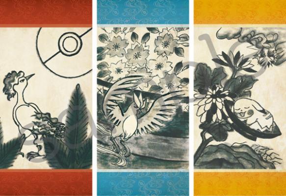 ファイヤー・フリーザー・ピカチュウとサンダーの3種の札が墨絵の掛け軸に!