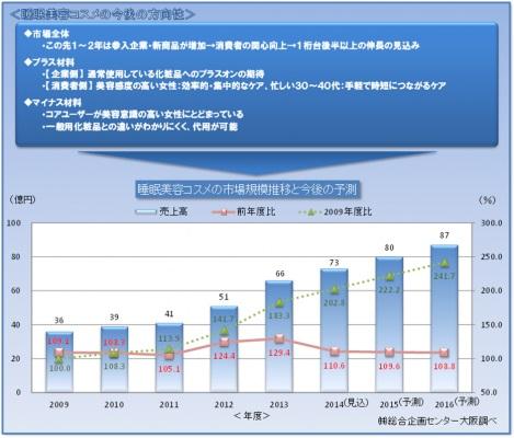 ●今後も、参入企業・新商品の増加とともに消費者の関心も高まり、2016年度には87億円に拡大する見通しとなった。参入企業は、通常使用している化粧品へのプラスオンが期待できることから、販売強化に乗り出す見通し。また、美容感度の高い女性や家事や子育て、仕事に忙しい30~40代女性から同アイテムの“塗って寝るだけ”“寝ながら美容”という手軽さや時短のコンセプトが指示を得る見込み。