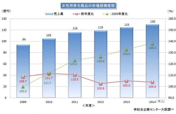 ●女性用育毛商品の2013年度の売上高は、前年度比5.0%増の125億円となった。伸びた要因としては、新規参入企業の増加や需要の裾野拡大、増税前の駆け込み需要等が挙げられる。