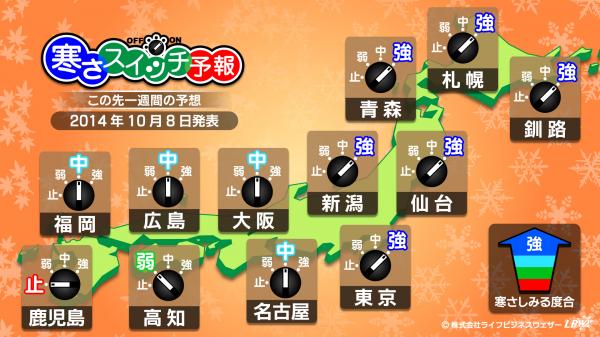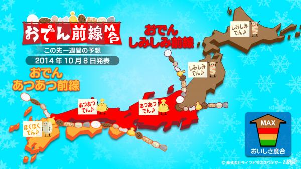 生活密着型天気予報を配信する株式会社ライフビジネスウェザー(本社:東京都中央区、代表取締役:石川勝敏 以下、LBW)は、2014年10月8日、特設サイトにて寒さの到来をいち早く伝える「寒さスイッチ予報」及び、寒さと関係のあるおでんのおいしい度合を伝える「おでん前線」予報の第4回発表を行いました。