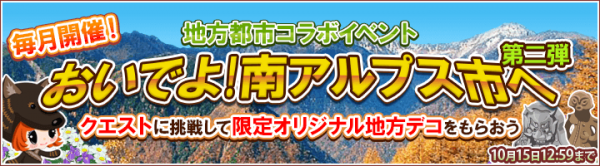 株式会社エルディ(本社:東京都目黒区、代表取締役:宮崎 尚登)と、株式会社サクセス(本社:東京都品川区、代表取締役:吉成 隆杜)は、山梨県南アルプス市観光協会(中込博文会長)と提携し、2014年10月8日(水)メンテナンス終了後18時より、アプリゲーム『畑っぴ~里山くらし~』にて、期間限定イベント「毎月開催! 地方都市コラボイベント おいでよ!南アルプス市へ 第二弾」を開始いたします。